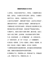 调查研究类排比句40例1.走到位、力戒走马观花不深入,问到位、力戒脱离主题太随意,说到位、力戒满口应承无原则,想到位、力戒敷衍做作不交心,做到位、力戒高高在上不作为。2.慰问可以“唠家常”,调研却需“不客套”;总结可以“绣花衣”,调研却需“开药方”;探索可以“等观望”,调研却需“急行军”。3.翻阅的是“补充完善”的材料,听到的是“反复斟酌”的汇报,看到的是“精心布置”的场景,见到的是“严格挑选”的群众。4.围绕中心、服务大局的“引领性”调研,解决问题、改进工作的“小切口”调研,总结经验、深化实践的“指导式”调研。5.多一些发现创新、少一些“翻版再版”,多一些真知灼见,少一些照本宣科,多一些“一...