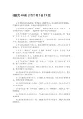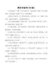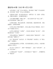 排比句金句(40组)1.把百姓的“小事”作为大事来办,把百姓的“难事”作为急事来抓,把百姓的“愁事”作为心头事来解决。2.强化深入基层、深入群众的自觉,永葆为官一任、造福一方的追求,锤炼为民服务、为民解忧的能力。3.真正拥护爱戴的“感恩工程”,真正支持参与的"民心工程",真正受益得利的“德政工程”。4.多做打基础、利长远的好事,多做补短板、强弱项的实事,多做破瓶颈、克顽疾的难事。5.在恒心韧心中抓本领提升,在真心诚心中拉近干群距离,在实干苦干中温暖人民本心。6.多怀心系群众的“人情味”,多沾深入群众的“泥土味”,多留服务群众的“汗水味”。7.群众意愿表达“畅通有序”,协商民主机制"规范有效”,...