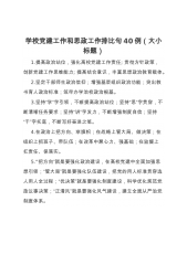 学校党建工作和思政工作排比句40例(大小标题)1.提高政治站位,强化高校党建工作责任;贯彻方针政策,创新党建工作思维能力;提高结合意识,丰富思想政治教育载体。2.坚定干部师生政治信仰;增强基层组织政治功能;突出教书育人政治标准;筑牢办学治校政治根基。3.坚持“学”字引领,不断提高政治站位;坚持“思”字贯穿,不断清晰任务要求;坚持“讲”字发力,不断增强制度自信;坚持“干”字托底,不断写好奋进之笔。4.在政治上把方向、举旗帜;在战略上管大局、做决策;在组织上抓班子、带队伍;在改革中聚心力、强基础;在监督上扛责任、保落实。5.“把方向”就是要强化政治建设,在高校党建中全面加强思想引领;“管大局”就是...
