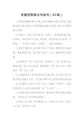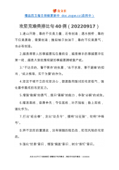 精品范文每日持续更新中doc.zsgw.cc(启用中)攻坚克难类排比句40例(20220917)1.逢山开路,靠的不仅是力量,还有创造;遇水搭桥,靠的不仅是勇敢,需要创造;撸起袖子加油干,靠的不仅是勇气,也必有创造。2.越是得罪人的事越要站在最前沿,越是棘手的事越要冲在第一线,越是大家犹豫观望的事越要捅破窗户纸。3.“不达目的、誓不罢休”的执着,“志不求易、事不避难”的担当,“成之惟艰、实干为要”的作为。4.坚定不破不立的攻坚决心,提振敢闯敢试的攻坚锐气,强化善作善成的攻坚定力。5.增强“敢解”的勇气,提升“善解”的能力,争取“必解”的成效。6.瞄准高线,奋勇争先;守住底线,补齐短板;敢上前线...
