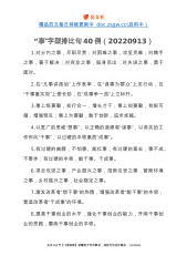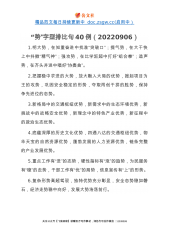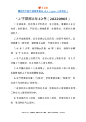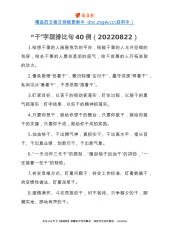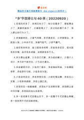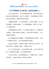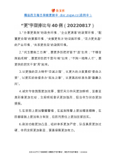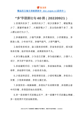 精品范文每日持续更新中doc.zsgw.cc(启用中)“一”字型排比句40例1.做到一生学习,坚守沉静品格;理清一个脉络,加固理论大厦;训练一种思维,增强辩证能力;坚定一个理想,提振追求底气;涵养一种正气,夯实拒腐定力。2.深化“一件事”集成改革,推动办事更便利;深化“一网式”集成服务,推动数据更畅通;深化“一张单”集成审批,推动审批更精简。3.做一个见证者,需要鼓足劲,全神贯注;做一个建设者,需要鼓足劲,脚踏实地;做一个开创者,需要鼓足劲,创新探索;4.一个问题一个问题地去破解,一个环节一个环节地去突破,一个项目一个项目地抓落实,一项工作一项工作地去推进。5.在思想认识上要再高一层,在严格对...