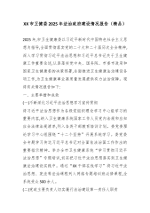 XX市卫健委2025年法治政府建设情况报告(精品)2025年,市卫生健康委以习近平新时代中国特色社会主义思想为指导,全面贯彻落实党的二十大和二十届历次全会精神,深入学习贯彻习近平法治思想和习近平总书记关于卫生健康工作重要论述,认真落实党中央、国务院、市委市政府和国家卫生健康委的决策部署,全面推进卫生健康法治建设各项工作,为卫生健康事业高质量发展提供有力法治保障。现将有关情况报告如下:一、主要举措和成效(一)不断深化习近平法治思想学习宣传贯彻将习近平法治思想作为各级党组织理论学习中心组学习的重要内容,纳入卫生健康系统国家工作人员党内法规和应知应会法律法规清单,列入各类干部教育培训计划。委党委理论学习中心组围绕“十二个坚持”开展系统学习。委党委会专题学习传达习近平总书记对全面依法治国工作作出的重...