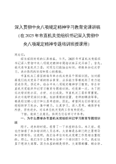 深入贯彻中央八项规定精神学习教育党课讲稿(在2025年市直机关党组织书记深入贯彻中央八项规定精神专题培训班授课用)同志们:经过前段时间的认真准备,今天,2025年市直机关党组织书记深入贯彻中央八项规定精神专题培训班正式开班了。首先,我代表市直机关工委,对同志们能抽出时间,积极参加这次学习,表示热烈的欢迎和衷心的感谢。市直机关工委坚持每年举办机关党务干部培训班,这对提高我们机关党务干部的综合素质、业务能力等都起到了有力地促进作用。但近年,结合中央八项规定精神学习教育,举办市直机关党组织书记学习教育专题培训班,还是第一次。为了把这次培训班办实、办好、办出成效,市直机关工委非常重视,多次与我研究培训...