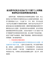 2024年专题民主生活会、组织生活会对照检查、批评和自我批评意见汇总范文稿 一、学习贯彻习近平新时代中国特色社会主义思想方面 1.理论学习不够深。虽然能够认真学习贯彻习近平新时代中国特色社会主义思想,对这一思想的深刻内涵有系统掌握,但学习的深度和广度还有待提升,一些学习满足于完成组织安排的集中学习,满足于读原著学原文悟原理,满足于理解字面含义,存在知其言不知其义、知其然不知其所以然的情形。 2.学以致用不够紧密。尽管努力做到用习近平新时代中国特色社会主义思想武装头脑、指导实践、推动工作,但也存在认真思考和融会贯通不够,系统吸收和整体把握不够,活学活用和落细落小不够。 3.理论武装有所放松...