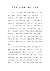 公安局2019年第一季度工作总结今年以来,县公安局以平安XX建设为抓手,以各项安保任务为重点,早动员、早部署,全力打击整治犯罪、严密安全防范、夯实队伍管理、深化“放管服”改革等工作,有效维护了全县社会政治和治安大局稳定,为“践行新使命、忠诚保大庆”主题实践活动的顺利开展打下了良好的基础。一、以扎实做好各项安保工作为首任,强化措施落实,全力维护重要节日社会大局稳定。紧紧围绕春节、元宵节、清明节和全国省市县各级“两会”安保任务,强化底线思维,有力确保了法定节假日及“两会”期间全县大局的总体稳定。春节七天长假全县无刑事发案、无较大以上事故发生。元宵节期间,圆满完成了“城关街道首届锣鼓秧歌大赛”活动及...