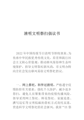 清明节期间开展文明祭祀倡议书广大市民朋友们:又是一年春草绿,梨花风起清明时。清明节是我们慎终追远、感恩先辈的传统节日。今年的清明,适逢全市上下众志成城、全力防控新冠肺炎疫情的关键时期,为倡导文明新风,保护生态环境,切实巩固现阶段疫情防控成果,市文明办发出如下倡议:一、移风易俗,文明祭祀。希望广大市民转变传统祭祀的旧观念,树立厚养薄葬的新观念。倡导节俭祭扫,坚决抵制封建迷信活动和低俗祭祀用品,提倡家庭分散追思、经典诵读、鲜花祭奠、网络祭祀等文明环保又符合疫情防控要求的祭祀形式。不组织、不参加聚集性祭扫活动,防止疫情扩散和反复。二、严防火灾,安全祭祀。希望广大市民树立环保意识,带头严格遵守森林防火...