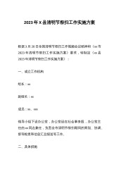 xx县2022年清明节祭扫工作方案为全面做好清明节期间群众祭扫服务和安全保障工作,提高殡葬行业服务质量,倡导移风易俗,树立文明祭扫新风尚,在做好疫情防控的同时实现我县2022年清明节祭扫工作安全、文明、和谐、有序开展,结合我县实际,制定本方案。一、工作目标深入学习贯彻XJP总书记关于安全生产重要论述,认真贯彻落实党中央、国务院、自治区、银川市及县委、县政府关于殡葬工作的决策部署,开展以“文明祭扫、保护环境、平安清明”为主题的清明节祭扫活动,以实现文明祭扫、平安清明为目标,确保清明节祭扫服务保障工作平稳有序、顺利圆满,人民群众安全。通过清明节祭扫、移风易俗,倡导新型祭扫方式,传承中华民族传统美德...