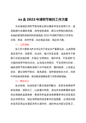 xx县2022年清明节祭扫工作方案为全面做好清明节期间群众祭扫服务和安全保障工作,提高殡葬行业服务质量,倡导移风易俗,树立文明祭扫新风尚,在做好疫情防控的同时实现我县2022年清明节祭扫工作安全、文明、和谐、有序开展,结合我县实际,制定本方案。一、工作目标深入学习贯彻XJP总书记关于安全生产重要论述,认真贯彻落实党中央、国务院、自治区、银川市及县委、县政府关于殡葬工作的决策部署,开展以“文明祭扫、保护环境、平安清明”为主题的清明节祭扫活动,以实现文明祭扫、平安清明为目标,确保清明节祭扫服务保障工作平稳有序、顺利圆满,人民群众安全。通过清明节祭扫、移风易俗,倡导新型祭扫方式,传承中华民族传统美德...