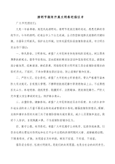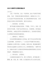 清明节期间开展文明祭祀倡议书广大市民朋友们:又是一年春草绿,梨花风起清明时。清明节是我们慎终追远、感恩先辈的传统节日。今年的清明,适逢全市上下众志成城、全力防控新冠肺炎疫情的关键时期,为倡导文明新风,保护生态环境,切实巩固现阶段疫情防控成果,市文明办发出如下倡议:一、移风易俗,文明祭祀。希望广大市民转变传统祭祀的旧观念,树立厚养薄葬的新观念。倡导节俭祭扫,坚决抵制封建迷信活动和低俗祭祀用品,提倡家庭分散追思、经典诵读、鲜花祭奠、网络祭祀等文明环保又符合疫情防控要求的祭祀形式。不组织、不参加聚集性祭扫活动,防止疫情扩散和反复。二、严防火灾,安全祭祀。希望广大市民树立环保意识,带头严格遵守森林防火...