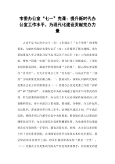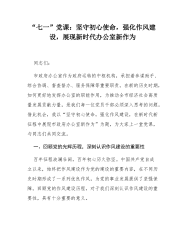 “七一”党课:坚守初心使命,强化作风建设,展现新时代办公室新作为同志们:市政府办公室作为政府运转的中枢机构,承担着参谋助手、综合协调、督查督办、服务保障等重要职责。在新的历史时期,如何更好地发挥办公室的职能作用,为推动全市经济社会高质量发展贡献力量,是我们每一位党员干部必须深入思考的问题。借此机会,我以“坚守初心使命,强化作风建设,在新时代新征程中展现市政府办公室新作为”为题,为大家上一堂党课,与同志们共同交流。一、回顾党的光辉历程,深刻认识作风建设的重要性百年征程波澜壮阔,百年初心历久弥坚。中国共产党自成立以来,始终把作风建设作为党的建设的重要内容,在不同历史时期形成了一系列优良作风,为党的事业发展提供了坚强保障。回顾党的作风建设历程,对于我们深刻认识作风建设的重要性,具有十分重要的意义。...