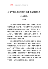 公文堂——海量公文资料,关注立即下载从百年党史中汲取前行力量答好组织工作时代答卷冷颖峰习近平总书记在庆祝中国共产党成立100周年大会上的讲话高瞻远瞩、内涵丰富,以“伟大建党精神”“九个必须”为我们做好新时代党的建设和组织工作指明了前进方向。站在“两个一百年”的历史交汇点上,组织部门要深刻领会习近平总书记“七一”重要讲话精神,传承和发扬伟大建党精神,把握核心要义,汲取强大力量,彰显组工担当,努力在新的赶考路上交出组织工作优异答卷。以伟大建党精神为旗帜,为党员干部培根铸魂。坚定的理想信念,是共产党人的政治灵魂,是共产党人经受住任何考验的精神支柱。组织部门作为“三个之家”,要系好对党忠诚的“扣子”,...