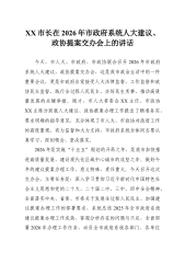 XX市长在市政府2026年人大代表建议和政协委员提案交办会上的讲话 同志们: 今天,我们召开市政府2026年人大代表建议和政协委员提案交办会,主要任务就是统一思想、明确责任、部署任务,正式启动今年的建议提案办理工作。刚才,会议现场向各承办单位交办了今年的建议提案办理件,这既是沉甸甸的责任,更是全市人民的信任与重托。首先,我代表市政府,向市人大、市政协长期以来对政府工作的有效监督和鼎力支持,表示衷心的感谢!向为提出这些高质量建议提案而付出辛勤劳动和智慧心血的人大代表、政协委员们,致以崇高的敬意! 每一年的这个时候,我们都会召开这样的会议。但今年的交办会,意义尤为特殊。当前,我们正处在全面深化改革开放、奋力谱写中国式现代化XX新篇章的重要时期。在这个承前启后的年份里,人大代表和政协委员...