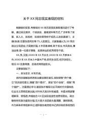 关于XX同志现实表现的材料根据组织安排,考察组对XX同志的现实表现情况进行了考察。通过民主测评、个别谈话、查阅资料等方式,广泛听取了区委、区人大、区政府、区政协领导班子成员,以及区直部门、乡镇(街道)主要负责同志等75人的意见。大家普遍认为,XX同志政治立场坚定,大局意识强,工作思路清晰,敢于担当,作风务实,廉洁自律,是一位德才兼备、实绩突出的优秀领导干部。XX,男,汉族,XXXX年XX月出生,XXXX年XX月参加工作,XXXX年XX月加入中国共党产,研究生学历,经济学硕士。现任XX区委常委、区政府常务副区长。主要表现如下:一、政治坚定,对党忠诚。该同志能够始终把政治建设摆在首位,“深刻领悟两个确”立的决定性意义,“”“”“增强四个意识、坚定四个自信、做到两”个维护。注重理论学习,能坚持不懈...