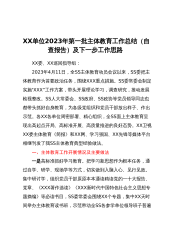 XX单位2023年第一批主体教育工作总结(自查报告)及下一步工作思路XX委、XX巡回指导组:2023年4月11日,全SS主体教育动员会议以来,SS委把主体教育作为首要政治任务,围绕XXX重点措施。SS委常委会制定实施“XXX”工作方案,带头开展理论学习,调查研究,推动发展检视整改。SS人大常委会、SS政府、SS政协等党员领导同志也都带头抓好自身教育,为各级党组织和党员干部放出样子、作出示范。各XX各单位周密部署、精心组织,全SS面上主体教育呈现出高起点开局、高标准开展、高质量推进的良好态势。XX卫视XX委主体教育《简报》和XX网、学习强国、XX先锋等媒体平台相继刊发了我SS主体教育典型经验做法...