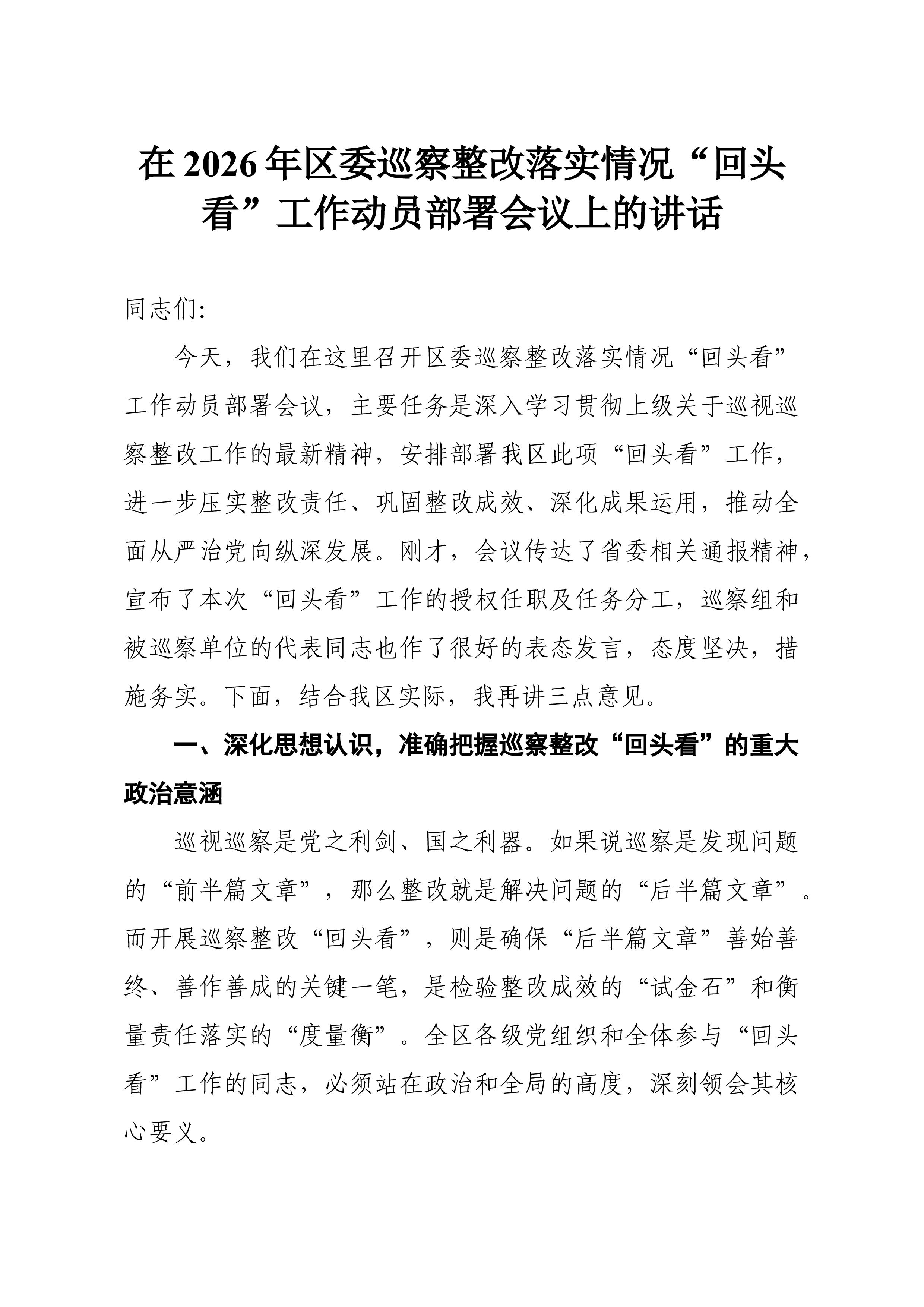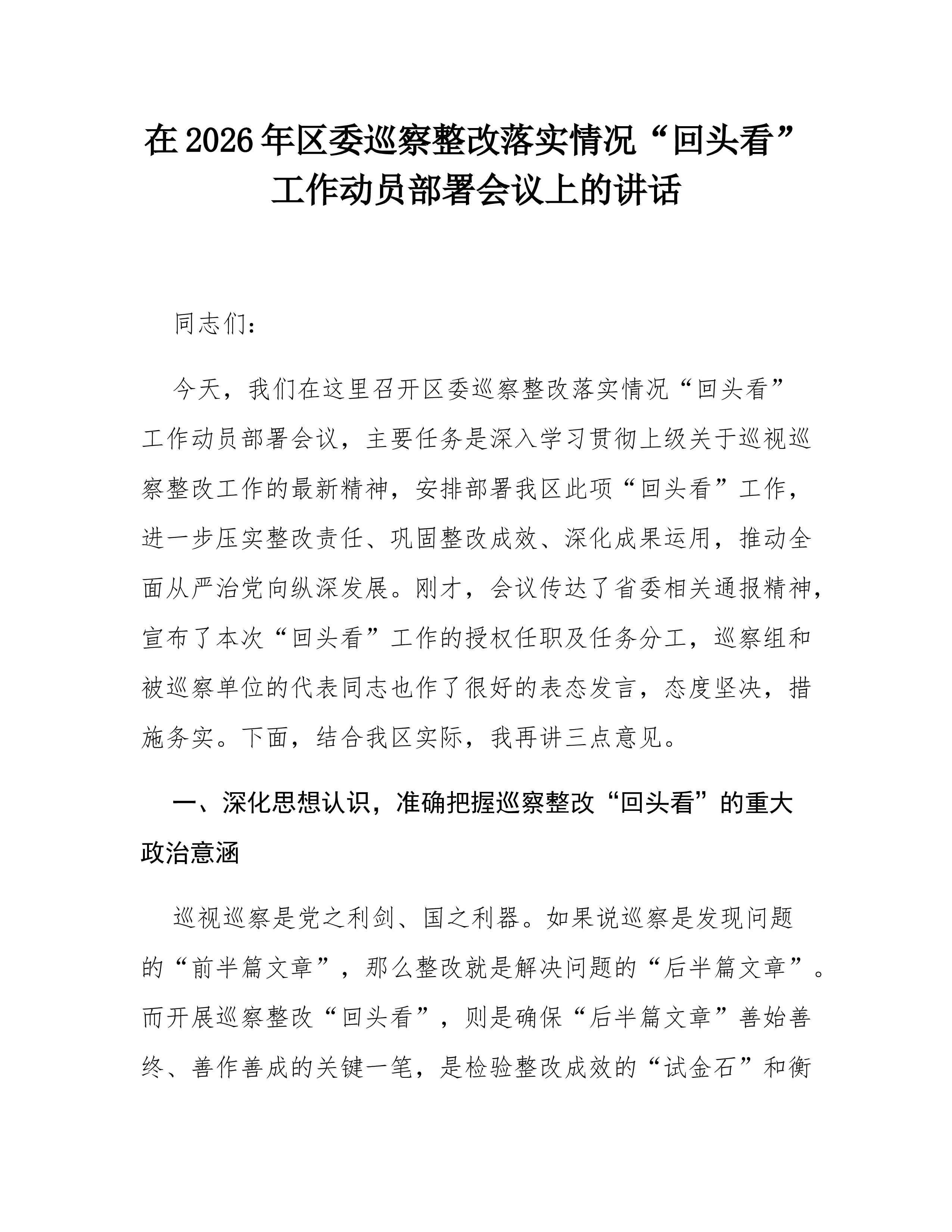 在2026年区委巡察整改落实情况“回头看”工作动员部署会议上的讲话同志们:今天,我们在这里召开区委巡察整改落实情况“回头看”工作动员部署会议,主要任务是深入学习贯彻上级关于巡视巡察整改工作的最新精神,安排部署我区此项“回头看”工作,进一步压实整改责任、巩固整改成效、深化成果运用,推动全面从严治党向纵深发展。刚才,会议传达了省委相关通报精神,宣布了本次“回头看”工作的授权任职及任务分工,巡察组和被巡察单位的代表同志也作了很好的表态发言,态度坚决,措施务实。下面,结合我区实际,我再讲三点意见。一、深化思想认识,准确把握巡察整改“回头看”的重大政治意涵巡视巡察是党之利剑、国之利器。如果说巡察是发现问题的“前半篇文章”,那么整改就是解决问题的“后半篇文章”。而开展巡察整改“回头看”,则是确保“后半篇...
