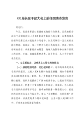 集团新提拔干部任职表态发言大家好!很荣幸在此次干部调整中,被集团任命为办公室主任。这一任命,于我而言,是信任,是嘱托,更是沉甸甸的责任。集团的发展如同一艘破浪前行的巨轮,而我们每一次的干部调整,都是为这艘巨轮配备更优秀的领航员和水手。在这新征程的起点上,我满怀敬畏、感激与决心,在此向集团领导和各位同事表态。一、重修养,顾大局,不忘初心,矢志不渝(一)强化政治修养,提高政治站位.办公室作为集团的核心枢纽部门,其工作具有很强的政治性。我将深入学习党的理论,坚定政治立场,增强“四个意识”、坚定“四个自信”、做到“两个维护”,始终与集团党委保持高度一致。积极贯彻集团的战略决策,确保每一项工作都在正确的...