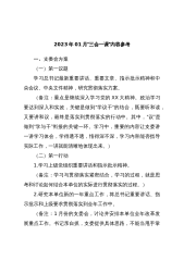 党支部2023年2月“三会一课”方案内容参考(含支委会、主题党日、党小组会、党课方案).(2篇)目录2023年02月“三会一课”内容参考2023年2月“三会一课”方案参考主题包括:—、支委会方案二、主题党日(党员大会方案)三、党小组会方案四、党课方案2023年02月“三会一课”内容参考—、支委会方案(一)第一议题1.学习总书记最新重要讲话、重要文章、指示批示精神和中央会议、中央文件精神,研究贯彻落实方案。(备注:支部委员要带头先学一步、深学一层,就精神主旨开展讨论,统一思想认识,抓住核心要义,结合单位实际明确贯彻落实的重点,提出本单位贯彻落实的方案。第一议题学习中应有意识安排讨论环节,发言内容...