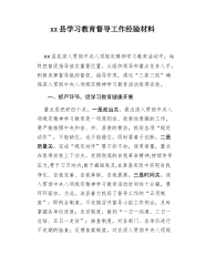 xx县学习教育督导工作经验材料xx县在深入贯彻中央八项规定精神学习教育活动中,始终把督促指导放在重要位置,从组织领导和重点任务入手,积极发挥督导组的督促、指导作用,通过“三抓三促”确保深入贯彻中央八项规定精神学习教育活动取得实效。一、抓严环节,促学习教育健康开展重点是把好四个关。一是政治关。提出深入贯彻中央八项规定精神学习教育是一项原则性、政策性很强的工作,要严格按照中央和省、市、县委的要求,抓好各项“规定动作”,不能缺位,也不能错位,同时要善于创新。二是质量关。完成“规定动作”要不折不扣,保质保量,重点在取得实效上下功夫。发扬彻底的自我革命精神,持续传导压力,勇于刀刃向内,敢于揭短亮丑,在真查实改中实现自我净化、自我完善、自我革新、自我提高。三是时间关。深入贯彻中央八项规定精神学习教育活动...