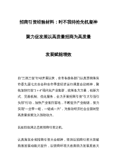 招商引资经验材料:时不我待抢先机凝神聚力促发展以高质量招商为高质量发展赋能增效自“三抓三促”行动开展以来,全市各级各部门认真贯彻落实市委九届七次全会和全市季度经济运行调度会议精神,聚焦加快打造“2+4”现代化产业集群,统筹各方力量,创新方式、完善机制、优化服务,全力开展招商引资“引大引强引头部”行动,加快产业项目落地,不断提升产业能级,努力实现“一企带一链,一链成一片”,为推动经济社会全面转型高质量发展注入强劲动力。以如饥似渴之态抢招商引资之机。认真落实全省招商引资大会精神,坚持以招商引资大突破助推发展动能大提升,以营商环境大改善助力发展质效大跃升,把招商引资作为全面转型高质量发展的重要支撑,...