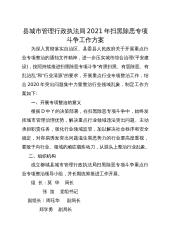 县城市管理行政执法局2021年扫黑除恶专项斗争工作方案为深入贯彻落实自治区、县委县人民政府关于开展重点行业专项整治的通知文件精神,进一步压实城市综合治理(平安建设),按照持续推进扫黑除恶专项斗争“有黑扫黑、有恶除恶、有乱治乱”和“行业清源”的要求,开展重点行业专项整治工作,结合2020年突出问题集中力量整治行业领域乱象,制定工作方案如下:一、开展专项整治的意义根据D中Y的决策部署,在扫黑除恶专项斗争中,始终发挥城市管理治理优势,解决重点行业领域违法突出问题。主动承担职责任务,强化行业领域监管,加以解决社会秩序和安全稳定,对容易诱发突出问题滋生黑恶势力的行业要高度重视,要敢于向行业、领域的顽症痼...