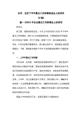 在市、全区下半年重点工作部署推进会上的讲话(2篇)篇一:2021年全去重点工作部署会上的讲话同志们:经工委、管委会研究决定,今天上午召开全区2021年下半年重点工作部署会,刚才Xx分别就精准扶贫、扫黑除恶和平安稳定等工作传达了精神,学习了经验,部署了工作,请大家抓好落实。等会,X书记还将作重要讲话,请大家认真学习、深刻领会,抓好贯彻落实。下面,我就如何做好下半年X高质量发展讲两个方面的意见。一、上半年重点工作回顾今年以来,在市委、市政府的坚强领导和关心下,我区坚持中国农谷核心区建设不动摇,紧扣高质量发展要求,聚焦生态农产品加工和农耕文化旅游两大产业,抢抓乡村振兴、农垦改革等多重机遇,扎实推进各...