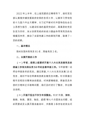 2022年上半年,在上级党委的正确领导下,我村党支部认真落实镇党委政府安排的各项工作,认真学习贯彻党的十九届六中全大精神,以习近平新时代中国特色社会主义思想为指引,以建设标准的基层党组织,高素质的党员队伍为目标,充分发挥党组织的战斗堡垒作用和党员的先锋模范作用,推动了支部党建工作的顺利开展,取得了一定的成绩。一、基本情况我村支部共有党员91名,预备党员2名。二、主要开展的工作(一)年初,按照上级要求开展十八大以来发展党员的排查工作和光荣在党50年纪念章申报工作。今年新增一名符合申报条件的党员。通过排查,十八大以来共发展16名党员,我村不存在带病和违规发展党员问题。针对排查过程中发现的日期有涂改...
