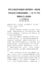 顶天立地追求卓越奋力谱写国内一流的城市综合性大学建设新篇章——在XX大学揭牌仪式上的致辞XX大学党委书记(2026年4月8日)尊敬的各位院士,各位领导,各位旅港同乡,各位来宾,各位校友,老师们、同学们:大家上午好!春风浩荡,盛事启章;学府焕彩,薪火传扬。在这春和景明、万物勃发的美好时节,我们齐聚风则江畔,隆重举行绍兴大学揭牌仪式,共同见证这一载入学校历史、惠及古越大地的里程碑时刻!此刻,我们心潮澎湃、倍感振奋!我代表绍兴大学,向长期以来亲切关怀、大力支持学校建设发展的教育部、省委省政府、省委组织部、省教育厅和市委市政府,向心系桑梓、捐资兴学的绍兴旅港同乡会,向鼎力相助、全程护航的市级各部门、各区县市党委政府,向为“绍大梦”接续奋斗的学校历任老领导、离退休老同志,向心系学校、倾情助力的院士专家...