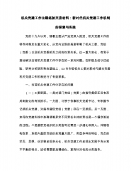 机关党建工作主题经验交流材料:新时代机关党建工作机制的探索与实践党的十九大以来,随着全面从严治党深入推进,机关党建工作的领导体制发生重大变化,从党内法规的高度明晰了机关工委、党组(党委)以及机关党委相互之间的权责关系。这一重大变化,有利于推动解决当前机关党建工作中存在的一系列问题。在积极总结以往经验、研判分析新形势的基础上,xx市市级机关工委对新时代健全完善机关党建工作机制进行了有益探索。一、当前机关党建工作中存在的问题(一)工委层面。一是对部门党组(党委)的指导督促还没有形成制度化的有效抓手。一方面,习惯于依靠机关党委书记、专职副书记抓机关党建,对指导督促党组(党委)存在一定顾虑。另一方面,...