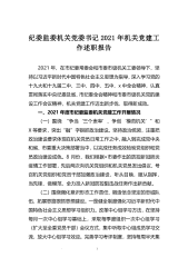 ·1纪委监委机关党委书记2021年机关党建工作述职报告2021年,在市纪委常委会和市委市级机关工委领导下,坚持以习近平新时代中国特色社会主义思想为指导,深入学习党的十九大和十九届二中、三中、四中、五中、x中全会精神,认真贯彻落实中央纪委及省、市纪委全会精神和市委市级机关党的建设工作会议精神,机关党建工作迈出新步伐、取得新成效。一、2021年度市纪委监委机关党建工作开展情况(一)围绕“争当‘三个表率’、争创‘模范机关’”和X等要求,突出“融”字狠抓政治建设。坚持政治统领,注重把政治建设要求体现在机关党员日常工作之中,融入到完成党中央和省、市委重大决策部署当中,以完成任务成效检验党组织和党员政治建...