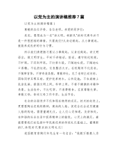 以党为主的演讲稿推荐7篇以党为主的演讲稿篇1尊敬的各位评委、各位老师,亲爱的同学们:其实,要想成为一名"讲文明,树新风"的时代青年并不是一件很困难的事情。只要我们?从身边做起,从小事做起,就能养成良好的行为习惯。所以我们清楚陋习要从小事做起,从身边做起。讲文明语言,做文明学生,平时不讲粗话,脏话。遵守校纪校规,不旷课,不迟到早退,不打架斗殴,不随地吐痰,不随地吐口香糖,不乱扔垃圾,仪表整洁大方,在校期间不化浓妆,不佩带首饰,不穿奇装异服,尊敬师长,见了老师主动问好,团结同学互帮互助。爱护花草树木,公共设施,不在桌椅上乱涂乱画。提倡文明上网,科学上网。不看不健康的书籍和录象。生活俭朴,不比吃穿。...