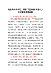 民政局党组书记、局长“五型政府”先进个人先进事迹推荐材料一、聚焦政治过硬,善学善思强化理论武装该同志坚持把政治建设摆在首位,严守党的政治纪律和政治规矩,不断增强“四个意识”、坚定“四个自信”、坚决做到“两个维护”。一是抓住“一个重点”。即把学习贯彻党的十九大和十九届四中、五中、六中全会精神和总书记的系列讲话为重点,把思想认识统一到党的决策部署上来,认真履行职责,切实关注民生。二是加强“两个建设”。即加强支部自身建设和党风廉政建设,充分发挥带头模范作用,筑牢拒腐防变的思想道德防线。三是坚持“三个制度”。即坚持党组中心组学习制度、“三会一课”制度和民主评议党员制度,定期召开党员大会和党小组生活会,...
