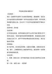 寻找身边英雄教案设计活动背景:我们一直教育学生要学习先辈的英雄事迹,爱国精神。现实生活中如何落实先辈的精神?有学生说真是生不逢时,和平时期,英雄毫无用武之地,怎么学习?针对学生的疑惑迷茫开展此次活动.适用年级:高年级活动目标:在寻找身边英雄,推荐英雄的过程中认识到“英雄”离我们并不是那么遥远,“英雄”做的也是普普通通的事。英雄就是认真的完成自己的工作,做平平常常的事他就在我们的身边,我们也能成为英雄。前期准备:各小队寻找、采访身边的英雄,拍摄采访视频,收集相关的实物、相片,上网搜索有关人物的报导作品。最后推荐一名英雄参与班级英雄比拼。活动过程:1、踩着《英雄儿女》的节奏进场各小队向队员推荐自己...
