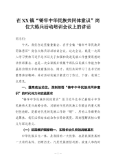 在XX镇“铸牢中华民族共同体意识”岗位大练兵活动培训会议上的讲话同志们:今天,我们在这里隆重集会,召开全镇“铸牢中华民族共同体意识”岗位大练兵活动培训会议。这次会议,既是一次深入学习贯彻习近平总书记关于加强和改进民族工作重要思想的动员部署会,也是一次全面提升我镇干部队伍民族工作能力和基层治理水平的战前集训会。刚才,我们共同学习了总书记的重要讲话精神,并对活动实施方案进行了传达。下面,我讲三点意见。一、提高政治站位,深刻领悟“铸牢中华民族共同体意识”的时代伟力和实践要求“铸牢中华民族共同体意识”是习近平总书记着眼于中华民族伟大复兴战略全局,对新时代党的民族工作提出的重大原创性论断,是新时代党的民族工作的“纲”,所有工作都要向此聚焦。我们必须站在政治和全局的高度,深刻理解其核心要义与深远意义。(...