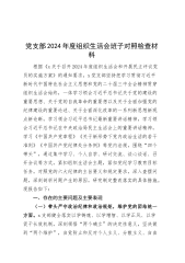 党支部2024年度组织生活会班子对照检查材料根据《x关于召开2024年度组织生活会和开展民主评议党员的实施方案》的通知要求,x党支部坚持把学习贯彻习近平新时代中国特色社会主义思想和党的二十届三中全会精神贯穿组织生活会始终,一体学习领会习近平总书记关于党的建设的重要思想、关于党的自我革命的重要想以及关于全面加强党的纪律建设的重要论述、关于全面深化改革的一系列新思想新观点新论断,学习领会习近平总书记最新重要讲话精神,学习领会习近平总书记在中央政治局民主生活会上的重要讲话精神,学习《中国共产党章程》《关于新形势下党内政治生活的若干准则》《中国共产党纪律处分条例》等党内法规,围绕“四个带头”,通过集中...
