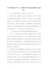 关于开展2022年“三八”国际妇女节纪念活动的通知(2369字)xx、xx各单位妇委会、妇女联合会、妇女小组:2022年是进入全面建设社会主义现代化国家、向第二个百年奋斗目标进军新征程的重要一年,是党的二十大召开之年。组织开展好2022年“三八”国际妇女节纪念活动,对引领广大妇女更加自觉拥护“两个确立”,做到“两个维护”,听党话跟党走,争做伟大事业的建设者、文明风尚的倡导者、敢于追梦的奋斗者具有重要意义。现就开展2022年“三八”国际妇女节纪念活动通知如下。一、突出主题,把学习宣传党的创新理论摆在首要位置今年“三八”国际妇女节纪念活动以“强国复兴有我”为主题,引领广大妇女巾帼心向党,喜迎二十大...