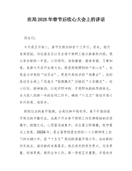 在某局2026年春节节后收心会暨“新春第一课”上的讲话同志们:岁启新章,骏马踏春。在欢乐祥和的春节假期后,我们齐聚一堂,召开节后收心会暨“新春第一课”,这既是重整行装、再启征程的工作惯例,更是凝心聚力、开局冲刺的必然要求。2026年是农历丙午马年,是“十五五”规划的开局之年,也是新中国成立77周年、建党105周年的重要年份。站在新的历史起点,全市交通运输事业发展面临新机遇、新任务、新挑战。我们必须迅速从“节日模式”切换到“战斗模式”,以“起步即冲刺、开局即决战”的奋斗姿态,收心归位、扛起责任,为全年工作开好局、起好步奠定坚实基础。下面,我结合当前形势与年度任务,讲三个方面的意见。一、深刻把握时代方位,以“马不停蹄”的紧迫感扛起“十五五”开局新使命总书记深刻指出,“锐始者必图其终,成功者先计于...