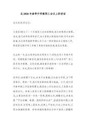 在2026年春季开学教职工会议上的讲话各位老师,同志们:大家好!度过了一个忙碌而又充实的寒假,我们有缘再次相聚。首先,我代表学校领导班子,向大家致以新春的问候:马年吉祥!前面,各位领导就新学期以及今后一段时期各自分管的工作,特别是近期开学工作做了具体详细的安排,我完全同意。过去的一年,在全体师生的共同努力下,学校各项工作稳中有进。党建根基不断夯实,教学改革逐步深入,“五育并举”育人体系初步搭建。这些成绩,凝结着在座的每一位老师的心血和汗水。在此,我向大家表示衷心的感谢!老师们:成绩属于过去,未来尽在掌握;过往皆为序章,当下即是锋芒。新的一年,我们迎来新的机遇与挑战。今天,我们召开新学期工作安排部署会,既是收心归位的会议,又是聚力启航的会议。其核心是把大家从假期模式尽快拉回到工作状态,主要目的...
