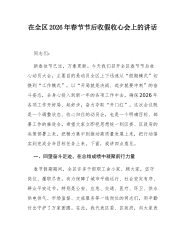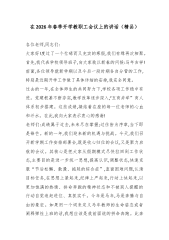 在2026年春季开学教职工会议上的讲话(精品)各位老师,同志们:大家好!度过了一个忙碌而又充实的寒假,我们有缘再次相聚。首先,我代表学校领导班子,向大家致以新春的问候:马年吉祥!前面,各位领导就新学期以及今后一段时期各自分管的工作,特别是近期开学工作做了具体详细的安排,我完全同意。过去的一年,在全体师生的共同努力下,学校各项工作稳中有进。党建根基不断夯实,教学改革逐步深入,“五育并举”育人体系初步搭建。这些成绩,凝结着在座的每一位老师的心血和汗水。在此,我向大家表示衷心的感谢!老师们:成绩属于过去,未来尽在掌握;过往皆为序章,当下即是锋芒。新的一年,我们迎来新的机遇与挑战。今天,我们召开新学期工作安排部署会,既是收心归位的会议,又是聚力启航的会议。其核心是把大家从假期模式尽快拉回到工作状态,...