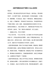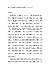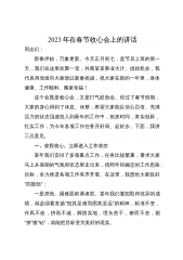 局领导班子在2023年收心会上的讲话同志们:新春伊始,万象更新。我代表局班子给大家拜个晚年,祝大家在新的一年里,身体健康、工作顺利、阖家幸福。节后上班第一天召开全体干部会议,基本上已经成为咱们局的惯例。它既是集中归位、调整状态的收心会,又是打气鼓劲开始工作的动员会。经过了春节假期,大家的身心得到了休息、休整,希望大家能以信心百倍、充满活力的状态迅速投入到新年的工作中,抢抓时间,务实创新,扎实工作,为今年各项工作任务开好局、起好步。下面,我讲3点意见。一、收假收心,立即进入工作状态XXX年我们安排了多项重点工作,任务比较繁重,要求大家马上从假期的气氛和状态里走出来,按照已经确定的思路、目标、方案...