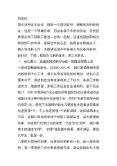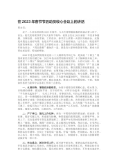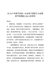 在2023年春节后第一次全体干部职工大会暨春节假期收心会上的讲话同志们:新春伊始,万象更新。今天正月初七,春节后上班的第一天,我们今天召开这次会议,既是收心会,也是各项工作的启动会。应该说,我市今年春节过得不错,一派繁荣稳定、祥和喜庆、整洁有序的气氛。俗话说,一年之计在于春,一日之计在于晨,一生之计在于勤。全体干部职工要尽快从松散的状态中走出来,重整旗鼓整装待发,以饱满的精神、快速的节奏、实干的作风,立即行动起来全身心投入工作,为实现新年开门红打好底、起好步、开好局。一是要调整状态,集中心思,全身心投入工作。要迅速集中心思,务必克服“年没过完,事不愿干”的不良习惯,拿出“开局就是决战、起步就是...