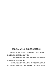 党组书记2018年度述职述廉报告从年初以来,我一直担任×××党组书记。现将一年来履职和廉洁自律等方面情况做如下报告:一、关于学习贯彻党的路线方针政策特别是习近平新时代中国特色社会主义思想的情况一是注重加强自身思想政治建设,牢牢把握正确的政治方向。认真学习贯彻党的十九大和全会精神,深入学习贯彻习近平总书记系列重要讲话精神和治国理政新理念新思想新战略特别是关于×××××××××一系列重要论述。党的十九大召开后认真学习贯彻会议精神,深入学习贯彻习近平新时代中国特色社会主义思想,进一步增强了政治意识、大局意识、核心意识、看齐意识,坚决维护以习近平同志为核心的党中央权威和集中统一领导,自觉在思想上政治上...