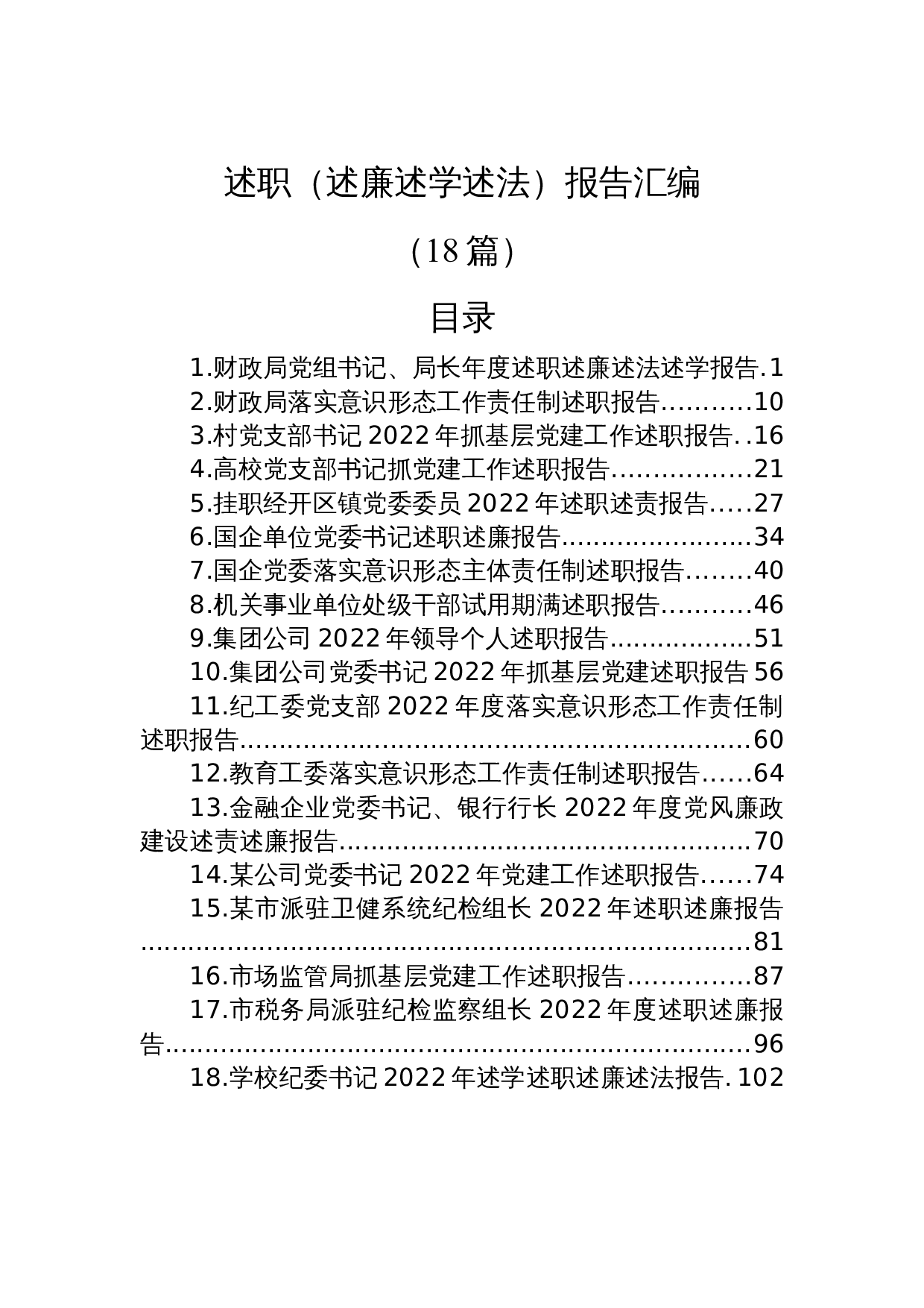 述职(述廉述学述法)报告汇编(18篇)目录1.财政局党组书记、局长年度述职述廉述法述学报告.12.财政局落实意识形态工作责任制述职报告...........103.村党支部书记2022年抓基层党建工作述职报告..164.高校党支部书记抓党建工作述职报告.................215.挂职经开区镇党委委员2022年述职述责报告.....276.国企单位党委书记述职述廉报告........................347.国企党委落实意识形态主体责任制述职报告........408.机关事业单位处级干部试用期满述职报告...........469.集团公司2022年领导个人述职报告...