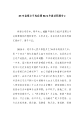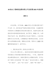 XX临水工程建设监理有限公司总经理2025年度述职报告2 时光荏苒,岁月如梭。2025年是公司发展进程中极不平凡的一年。面对复杂严峻的宏观经济环境、日益激烈的市场竞争以及繁重艰巨的改革发展任务,我始终坚持以高度的责任感和强烈的使命感,恪尽职守,勤勉工作,与领导班子成员一道,团结带领公司全体干部职工,以坚定的战略定力应对变局,以顽强的奋斗精神攻坚克难,以务实的行动举措推动发展。根据会议安排,现将本人2025年度履职情况报告如下,请予评议。 一、强化政治引领,把准企业发展方向 作为公司主要负责人,我深知坚持和加强党的全面领导是推动公司高质量发展的根本保证。一年来,我始终将政治建设摆在首位,持续巩固深化主题教育成果,引导全体干部职工深刻领悟“两个确立”的决定性意义,增强“四个意识”、坚定“四...