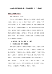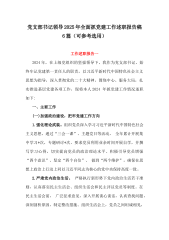 党支部书记领导2025年全面抓党建工作述职报告稿6篇(可参考选用)工作述职报告一2024年,在上级党组织的坚强领导下,我作为党支部书记,始终牢记党建第一责任人的职责,以习近平新时代中国特色社会主义思想为指导,深入贯彻党的二十大精神,围绕中心、服务大局,扎实推进基层党建各项工作,现将本人2024年抓党建工作情况述职如下:一、主要工作(一)加强政治建设,把牢党建工作方向1.强化理论武装。组织党员深入学习习近平新时代中国特色社会主义思想,通过“三会一课”、主题党日等活动,全年累计开展集中学习*次,专题研讨*次。要求党员利用业余时间开展自学,并撰写学习心得,切实提高党员的政治理论水平。积极引导党员增强...
