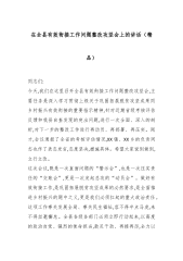 在XX县巩固拓展脱贫攻坚成果同乡村振兴有效衔接工作调度会上的讲话(精品)同志们:今天我们召开全县巩固拓展脱贫攻坚成果同乡村振兴有效衔接工作调度会,主要任务是深入贯彻落实习近平总书记关于“三农”工作的重要论述,严格按照党中央决策部署和省州工作要求,分析当前形势,查找问题短板,安排部署下一步重点工作。刚才,各乡镇、县级有关部门汇报了工作进展、存在问题和下步打算,相关同志作了点评,也通报了近期督导检查发现的问题,讲得都很好,很具体,很有针对性。打赢脱贫攻坚战,是我们过去几年工作的重中之重,取得了决定性的历史成就。在全县上下的共同努力下,我县累计实现XX个贫困村全部出列,XX户、XX余名建档立卡贫困人口稳定脱贫,贫困发生率历史性清零,绝对贫困问题得到历史性解决。这是我们必须充分肯定的伟大成就,是全体...