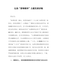 弘扬“雷锋精神”主题党课讲稿同志们:“如果你是一滴水,你是否滋润了一寸土地?如果你是一线阳光,你是否照亮了一分黑暗?”雷锋日记里的这段叩问,穿越63年的时光长河,至今仍在激荡着我们的心灵。今年3月,是毛泽东等老一辈革命家号召“向雷锋同志学习”题词发表63周年。63年来,雷锋精神早已成为中国共产党人精神谱系中的重要坐标。习近平总书记深刻指出:“让雷锋精神在新时代绽放更加璀璨的光芒,为全面建设社会主义现代化国家、全面推进中华民族伟大复兴凝聚强大力量。”今天,在2026年这个全面实施“十五五”规划的开局之年,也是巩固拓展脱贫攻坚成果同乡村振兴有效衔接的关键之年,我们在这里齐聚一堂,重温雷锋精神,就是要探寻其永恒的时代价值,将其转化为推动XX县高质量发展、实现乡村全面振兴的强大精神动力。下面,我结合...