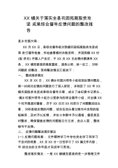 XX镇关于落实全县巩固拓展脱贫攻坚成果综合督导反馈问题的整改报告县乡村振兴局:XX月XX日,县综合督导组对我镇巩固拓展脱贫攻坚成果进行督导检查,实地查看镇村台账资料,并到我镇XX村(脱贫村)开展入户走访,于XX月XX日反馈问题清单XX条,XX镇党委政府高度重视,逐条认领,举一反三,对标问题抓好整改,现将整改情况汇报如下:一、整改推进情况XX月XX日,XX镇乡村振兴领导小组收到反馈问题后,第一时间对反馈的问题进行了深入研究,并制定了XX年XX镇巩固脱贫攻坚成果综合督导方案,成立了由纪委书记牵头,镇乡村振兴领导小组办公室参与的综合督导小组,对全镇XX个村开展逐村督查,并于XX日对XX村进行了问题整...