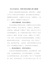 村支书交流发言:党建引领促发展凝心聚力谱新篇我村深入推进党建引领基层治理,把服务群众、造福群众作为工作的出发点和落脚点。通过创新村民议事机制、建强理论宣讲阵地、丰富群众文化生活,不断聚民心、润民心、暖民心,持续提升乡村善治水平。一、村事共商解难题,良性互动聚民心村党支部健全议事例会机制,定期研究讨论村庄发展和党建工作等事项,形成大事共议、实事共办、要事共研、急事共商、难事共解“五事联办”制度。将每月15日定为村民琐事接待日,深入开展面对面交流的“民声汇”活动,村民作为“嘉宾”讲问题、谈诉求、提建议,村“两委”干部、党员、村民代表和志愿者现场答疑解忧,并将难以解决的问题记录在册,一周内给予答复。...