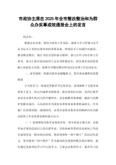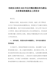 市政协主席在2025年全市整改整治和为群众办实事成效通报会上的发言同志们:根据会议安排,我结合政协工作实际,就深入学习贯彻习近平总书记关于党的自我革命的重要论述,特别是关于加强作风建设、推动整改整治、践行为民宗旨的指示精神,谈几点学习体会和工作思考。重点汇报市政协如何立足自身职能定位,将自我革命的要求融入协商民主实践,助推全市整改整治和为民办实事工作走深走实。一、深学细悟,把握自我革命精髓要义,筑牢政协履职的思想根基今天的学习,特别是罗毅君书记的讲话,深刻阐释了自我革命的重大意义、核心内涵和实践要求。我们深刻认识到,党的自我革命是党永葆生机活力的关键所在,也是破解发展难题、赢得人民拥护的根本途径。人民政协作为国家治理体系的重要组成部分,作为最广泛的爱国统一战线组织,必须自觉将自我革命的精神内...