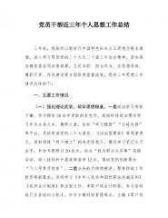党员干部近三年个人思想工作总结三年来,我始终以新时代中国特色社会主义思想为根本遵循,深入学习贯彻党的二十大及二十届三中全会精神,坚决落实镇党委各项决策部署,立足本职、担当作为,在思想淬炼、履职尽责、作风建设等方面取得显著成效。现将三年思想工作情况总结如下:一、主要工作情况(一)强化理论武装,筑牢思想根基。一是政治学习常抓不懈。作为拥有30余年党龄的老党员,我始终将政治理论学习作为立身之本、履职之基。依托“学习强国”“云岭先锋”等平台,系统研读党的二十大报告、《谈治国理政》等原著原文,深刻领悟“两个确立”的决定性意义,撰写学习笔记5万余字,参加专题研讨20余次。结合“我为群众办实事”实践活动,深入挂钩村开展政策宣讲12次,推动党的创新理论“飞入寻常百姓家”。二是业务能力持续精进。聚焦财政工...
